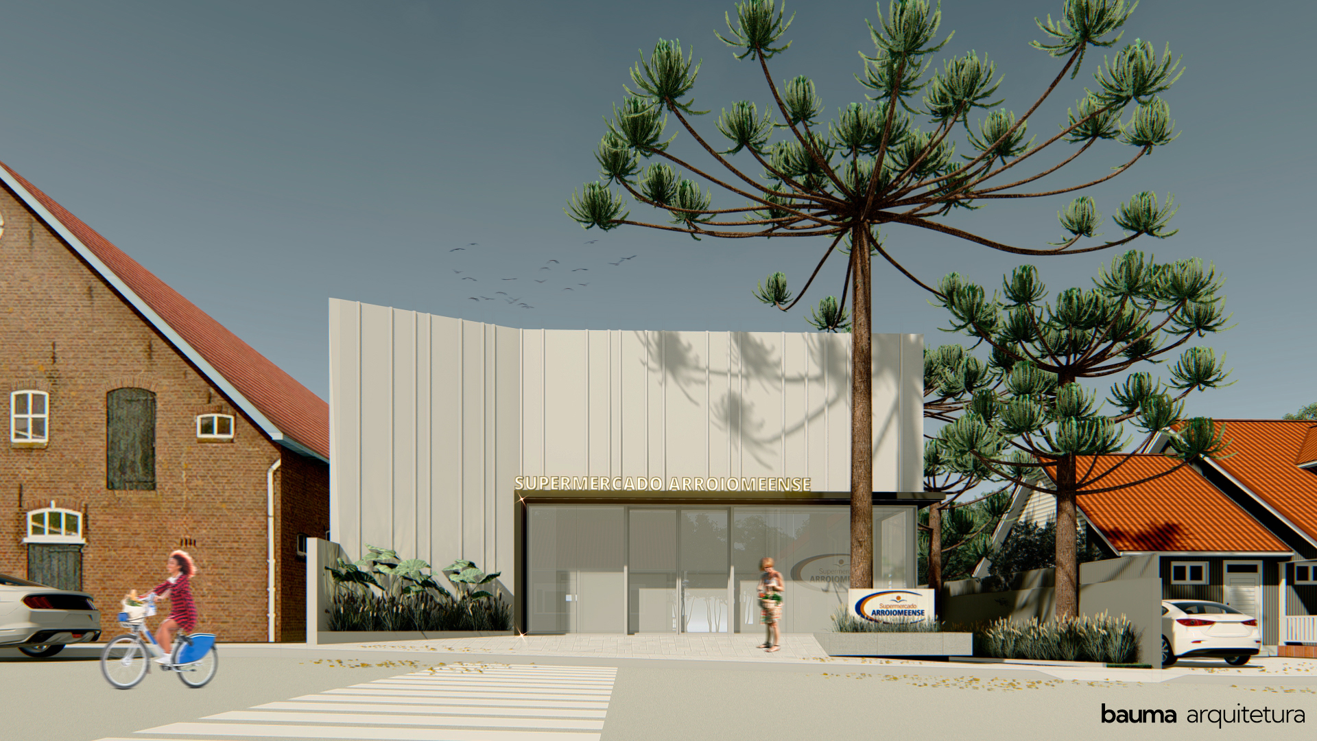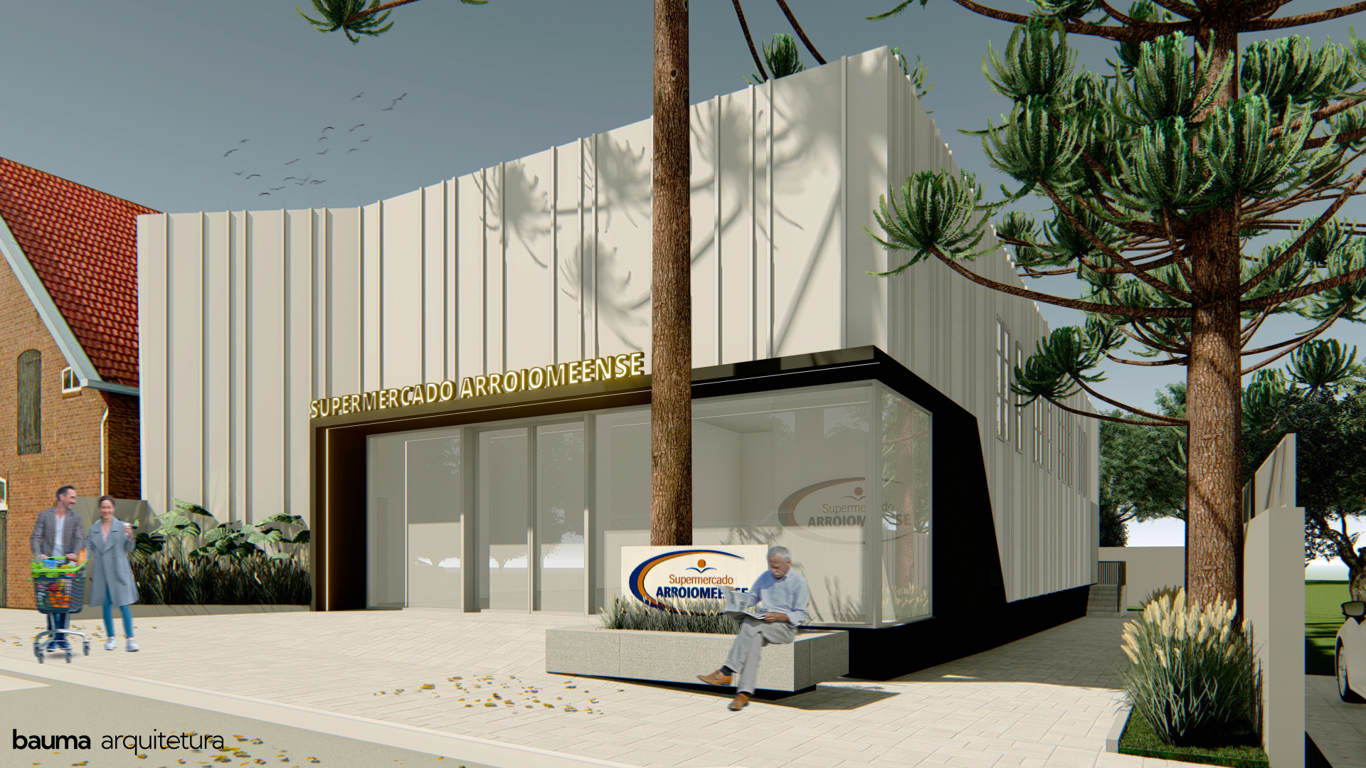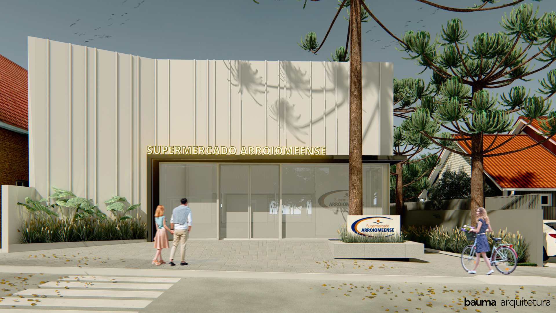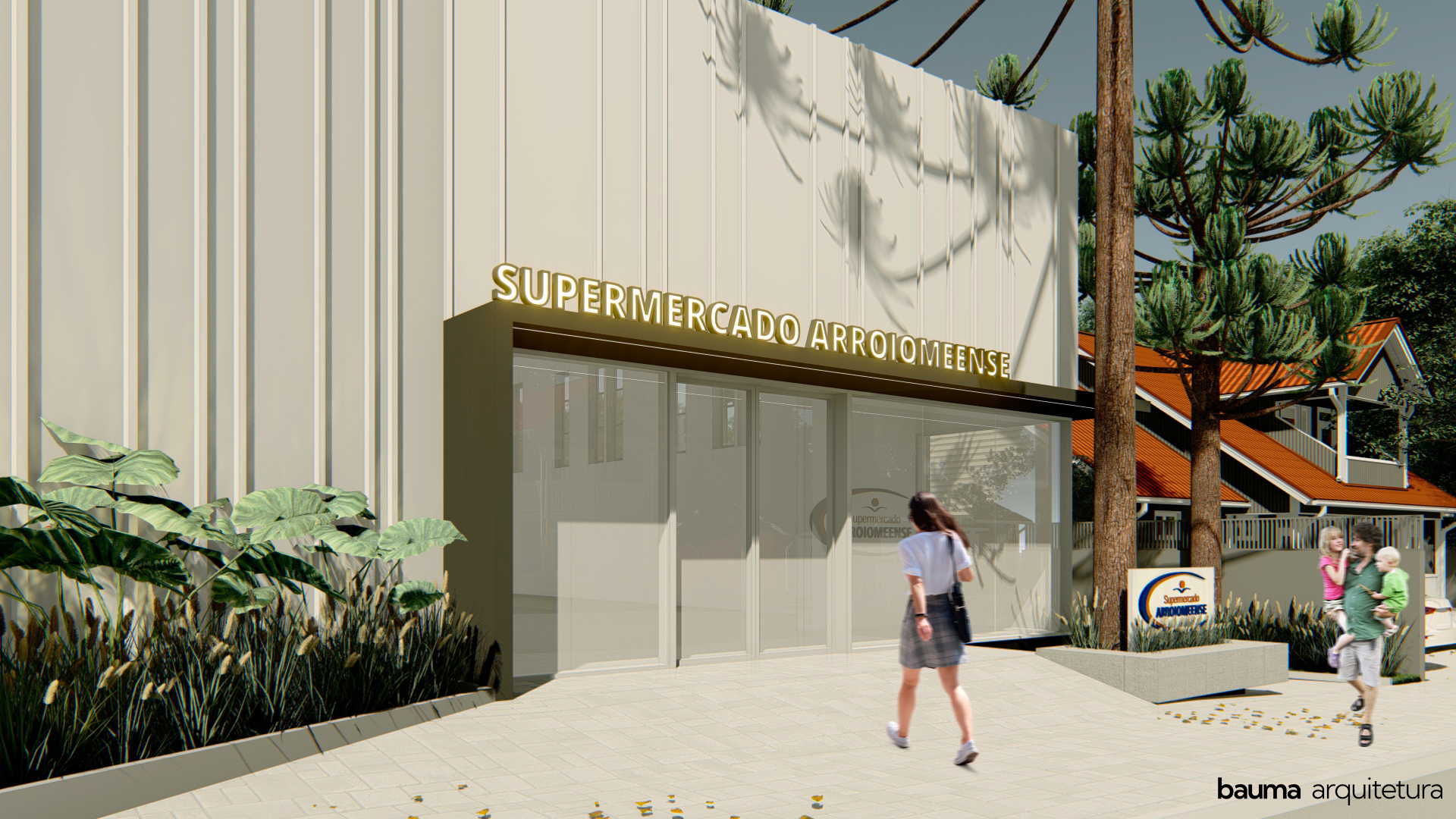 O estudo de projeto desenvolvido para o supermercado foi cuidadosamente pensado levando em consideração as características do terreno e a preservação das Araucárias existentes. Com a premissa de não remover essas árvores marcantes, a estratégia de recuar a edificação foi adotada, criando um ângulo na fachada que direcionando os clientes e ao mesmo tempo convidando-os a explorarem o espaço interno. A entrada do estabelecimento foi destacada através de uma marquise grafite que contorna a área de acesso, bem como a lateral de vidro que proporciona transparência e conexão visual.
